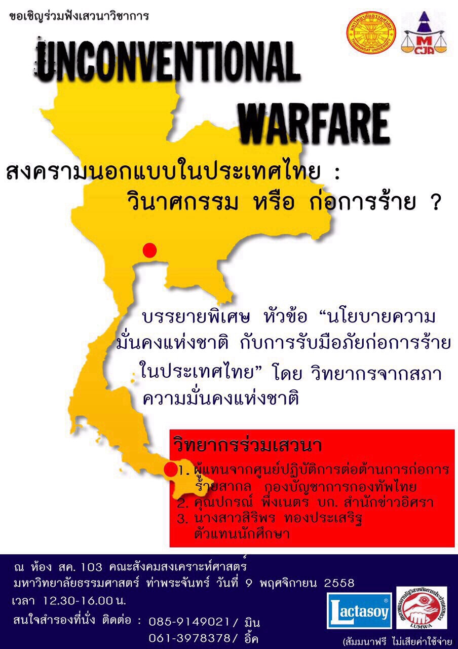 อยากชวนเพื่อนๆพี่ๆที่มีความสนใจมาร่วมฟังเสวนา หัวข้อเรื่อง "สงครามนอกแบบในประเทศไทย : วินาศกรรม หรือ ก่อการร้าย?" กันนะคะ จะมีงานสัมนาวิชาการในวันที่ 9 พฤศจิกายน 2558 เวลา 12.30-16.00 น. ณ ห
