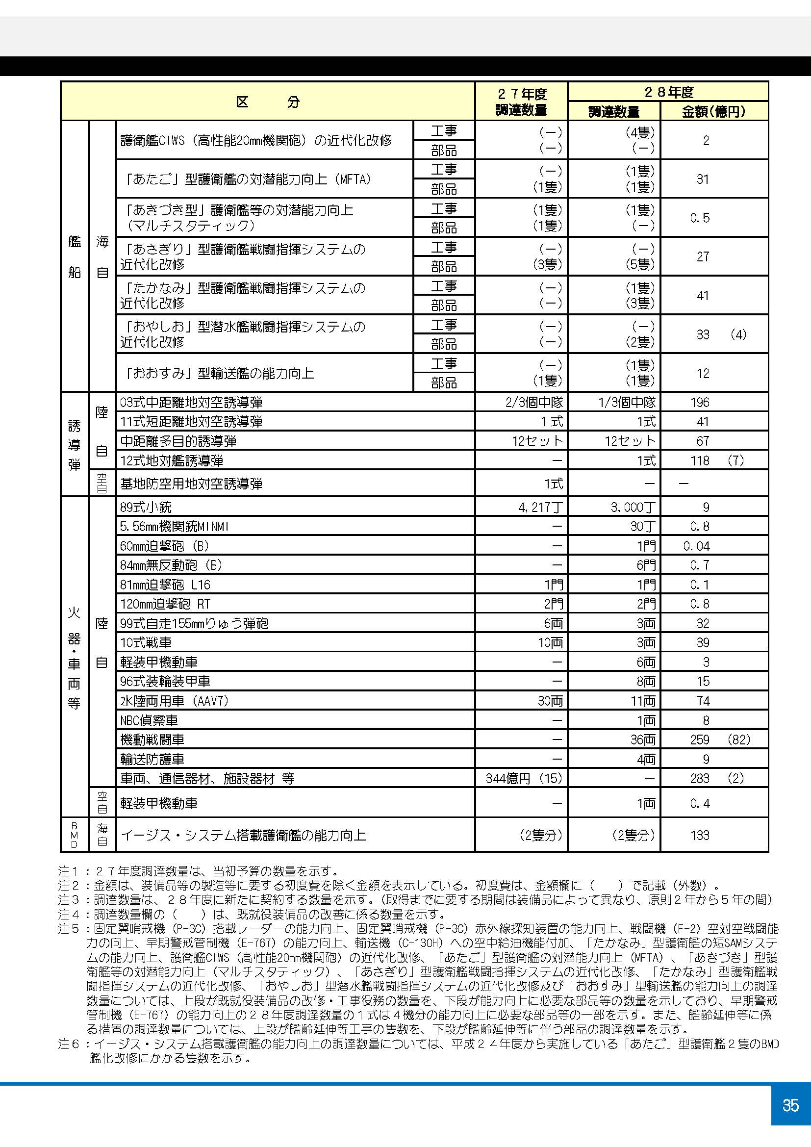 อ้างอิงตามเอกสารร่างงบประมาณปี 2016 ของกลาโหมญี่ปุ่น อาวุธหลักที่มีการจัดสรรงบประมาณแต่ละหน่วยมีดังนี้