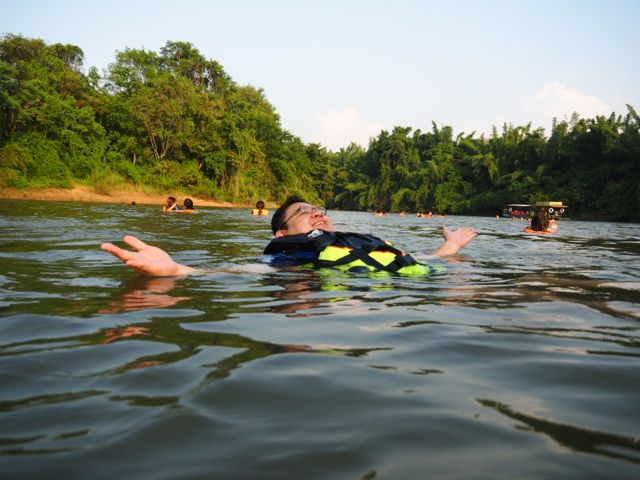 น้ำไหลพัดเรากลับไปที่แพ อ้อเรือลากเรามาไกลประมาณ 2 กิโลเมตร ในขณะที่ลอยคอกันอยู่ (ให้อารมณ์ไททานิคล่มมากๆ ชูชีพลอยเต็มไปหมด) ก็จะมีน้อง staff คอยดูแลแขกและให้คำแนะนำว่าให้ว่ายชิดขวาชิดซ้ายเพื่อไม่ให้ชนตลิ่ง ดีมากค่ะ จะมีช่วงนึงที่น้ำตื้นก็สามารถลุกขึ้นยืนได้ด้วย เห็นวิวทางรถไฟในมุมมองพิเศษด้วย