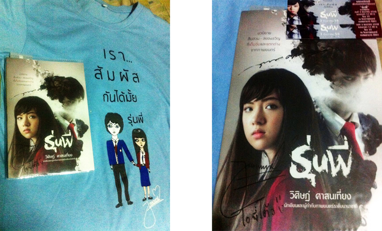 สุดท้ายสามไฮไลท์ของงานคือ 1.) การร้องเพลง "เธอเดินเข้ามา" ที่ใช้ประกอบภาพยนตร์ "รุ่นพี่" (Acoustic Version) ของ น้องพลอยชมพู อัพคลิป Public ไปแล้วในเฟซส่วนตัว, 2.) จับรายชื่อหาผุ้โชคดีรับเสื้อ "รุ่นพี่" ที่เป็นฝีมือการออกแบบของ น้องพลอยชมพู และร่วมถ่ายรุปร่วมบนเวที ส่วนตัวก็ไม่ได้คิดอะไรเพราะเป็นคนไม่มีโชคทางนี้อยู่แล้ว แต่ระหว่างพิธีกรประกาศมีอยู่ 2-3 รายไม่อยู่จนถึงช่วงที่ว่า ต้องจับหาใหม่จนถึงเสื้อตัวสุดท้าย จู่ๆพิธีกรก็เอ่ยชื่อออกมาซะงั้น แถมดันอ่านออกอีกเพราะเขียนด้วยลายมือชุ่ยมาก (ใครจะไปคิดว่าถุกจับมาอ่านล่ะ แต่สรุปก็ได้เสื้อมาเป็นที่ระลึกอีกอย่าง), 3.) แจกลายเซ็นต์และถ่ายรุป ขั้นตอนนี้ล่าช้าสักหน่อย เพราะต้องรอให้สื่อมวลชนรุมสัมภาษณ์ น้องพลอยชมพู หลุดมาได้ก่อนก็รัวปากกาและชัตเตอร์ไปเรื่อยๆ แต่ทางด้าน คุณวิศิษฎ์ ยังติดพันจนหลายคนยอมแพ้กลับไป ซึ่งก็ไม่รุ้ตาลุงคนสุดท้ายที่จ่อเทปสัมภาษณ์จะถามอะไรนักหนา ท้ายสุดมีหลายคนทนไม่ไหวจู่โจมให้เซ็นต์กันตรงนั้น (รวมถึงตัวเองด้วย ซึ่งก็เป็นคนสุดท้ายที่ได้อีกแล้ว 55) ก่อนจะโดนล้อมหน้าล้อมหลังไปกว่านั้น ทีมงานก็เข้ามาพาตัว คุณวิศิษฎ์ ไปนั่งโต๊ะเซ็นต์เป็นเรื่องเป็นราว ถือเป็นเสน่ห์ของงานที่มีรุปแบบความเป็นกันเองละนะครับ