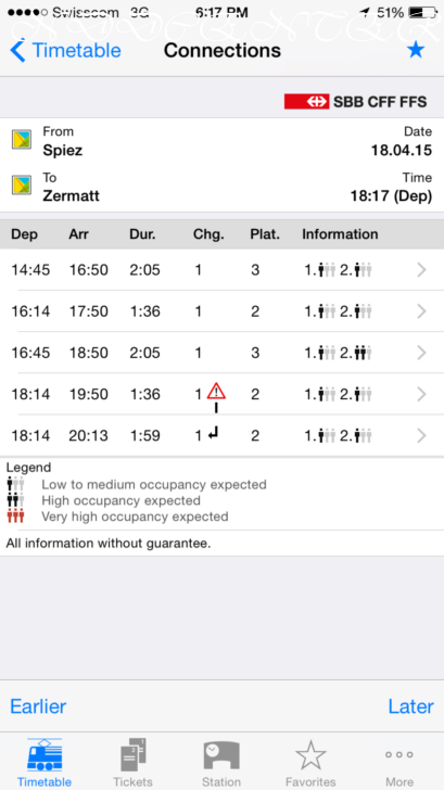 โปรแกรม SBB จะมีแจ้งเตือนตารางรถไฟปรับเปลี่ยนย้ายเวลาถ้าเพื่อนๆคนไหนไม่มีโปรแกรมหรือไม่ได้เปิด 3G ต้องคอยฟังประกาศให้ดีดีนะครับ ถ้าเป็นสถานีใหญ่ๆ รับรองได้มีวิ่งกันตับแล่บ ผมโดนมาแล้วครับ