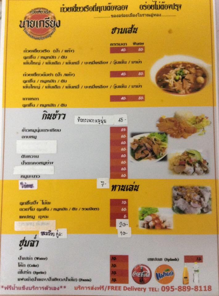 ชื่อร้าน "นายเกรียงก๋วยเตี๋ยวเรือ" ป้ายสีแดงเห็นเด่นชัดมาก แต่พอดูเมนูแล้วมีให้เลือกเยอะมาก ไม่ได้มีแต่ก๋วยเตี๋ยวเรือนะคะ มีเมนูข้าว เมนูทานเล่น ละก้อขนมถ้วย(ตามสเตปร้านก๋วยเตี๋ยวค่ะ) เราเห็นของใหม่ๆ เราก้อเลยอยากลอง สั่งมาให้หมด