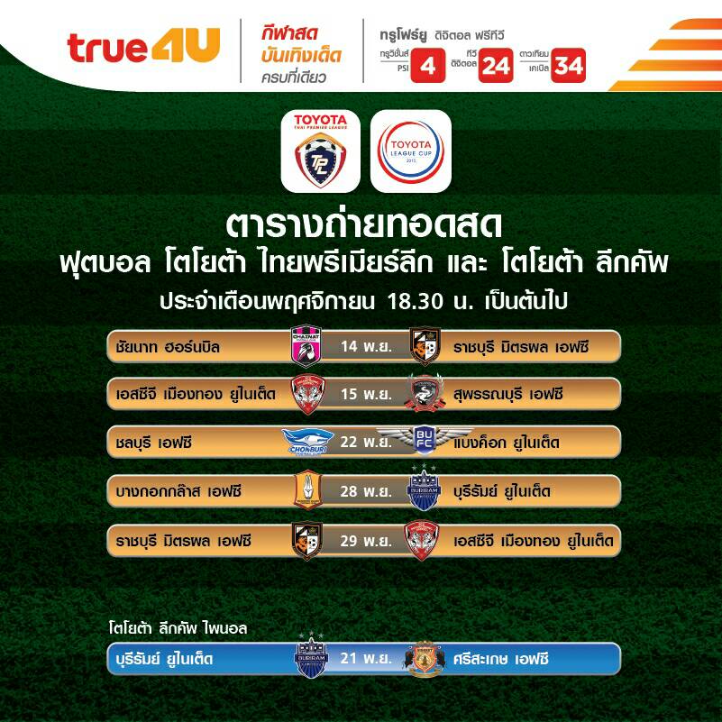 เอามาฝากกันจ้า เป็นตารางถ่ายทอดสดของช่อง True4u สำหรับฟุตบอลไทยเดือนนี้ โดยสัปดาห์นี้เป็นบอลทีมชาติเลยยังไม่มีไทยลีคเตะจ้า