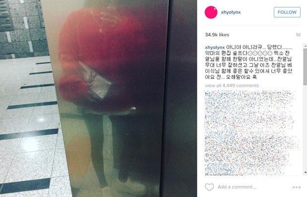ฮโยรินเขียนว่า "มันไม่ใช่ความจริงเลย ฉันสาบานได้ว่ามันไม่ใช่ความจริง ฉันถูกเคี้ยวของปีศาจการตัดต่อ นี่มันเป็นเรื่องเศร้า ฉันไม่ได้พูดถึงชานยอล EXO, เขาโชว์บนเวทีได้สุดยอดมาก และฉันดีใจที่ได้มีประสบการณ์ดีๆแบบนี้กับเขา และ Basick ด้วย อย่าเข้าใจผิดนะ"