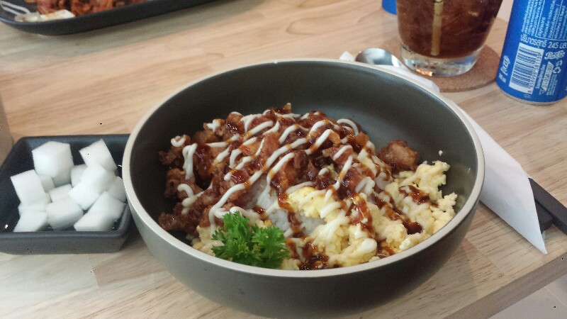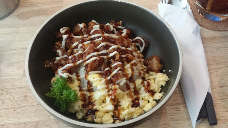 ข้างล่างจะเป็นข้าวค่ะ ข้างบนก็จะเป็นไก่ทอดกรอบ ราดซอสเทอริยากิกับซอสมาโย ด้านข้างคือไข่จ้าาา รสชาติใช้ได้นะคะ เราว่าโอเคเลย แต่ถ้ากินเข้าไปเยอะๆ อาจจะรู้สึกเลี่ยนหน่อย แต่ทางร้านก็เหมือนจะเข้าใจค่ะ เลยมีเครื่องเคียงมาด้วย