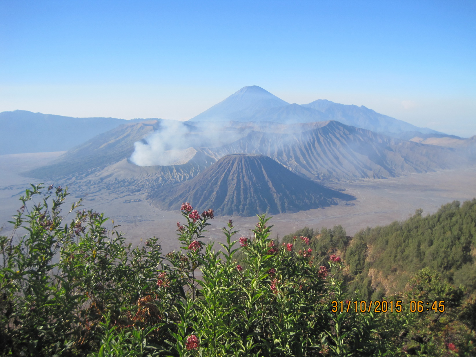 มาถึงสนามบินสุระบายาไม่มีที่แลกตังค์อีกที่นี่ไม่ได้เปิด24ชม.นะ คนขับรถของบ้านชมพูซึ่งอยู่กับเราตลอด5วันนี้ ชื่อบรัม (พูดภาษาอังกฤษได้ดีมาก)ช่วยหาคนรับแลกให้ได้เรทพอรับได้เสียเวลาต่อรองเล็กน้อย แวะminimartชื่อน้ำขนมนิดหน่อยก่อนออกเดินทางไปโบรโม่ถึงโบรโม่ตี4 อากาศเย็นมากฟันกระทบกันเลย เลยเสียเวลา(อีก)เช่าเสื้อหนาว 4คน1แสนรูเปีย เราเสียเวลามากเลยไม่ทันพระอาทิตย์ขึ้นที่จุดชมวิวดัง แต่ก็ดีคนกลับหมดเราค่อยขึ้น ที่นี่พระอาทิตย์ขึ้นเร็วมาก ตี5นี่สว่างแล้ว วิวโบรโม่ที่พิงจานากัน1สวยงามมาก