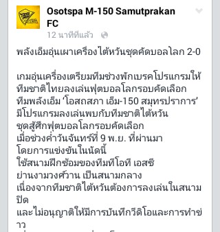 จบการแข่งขันในครึ่งเวลาแรก ฟุตบอลอุ่นเครื่องเตรียมทีม : โอสถสภา เอ็ม-150 สมุทรปราการ ออกนำ ทีมชาติไต้หวัน ชุดฟุตบอลโลกรอบคัดเลือก 2-0 โดยได้ประตูจากเอกพันธ์ อินทเสน ในนาทีที่ 23 และชัยณรงค์ ทาทอง ในนา