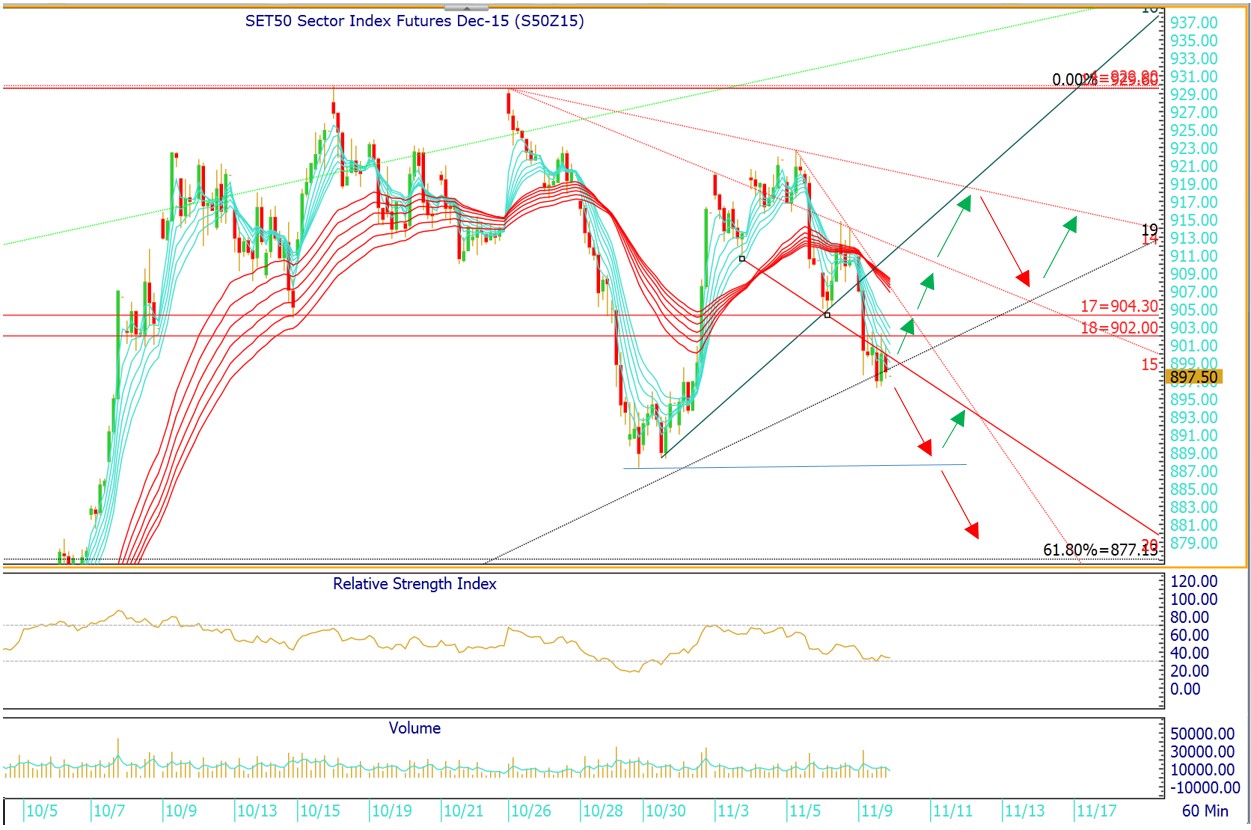 มีโอกาสปรับตัวหา แนวรับช่องแนวโน้มขาขึ้นระยะกลาง ที่ 87x โดยมี ระดับ 877.2 (61.8% Fibonacci Retracement )ทำหน้าที่เป็นแนวรับต่อไป