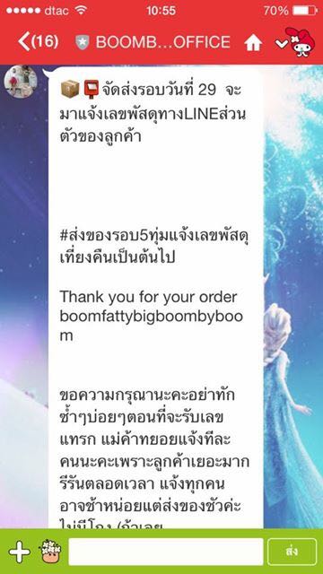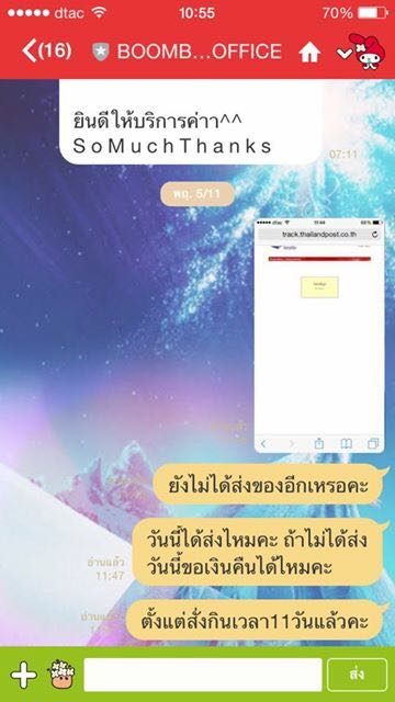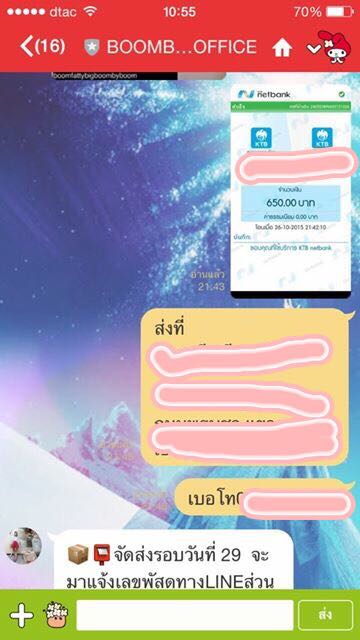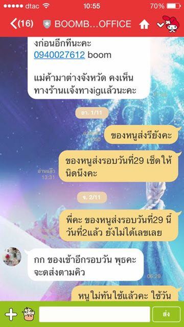 และจขกท.ก็ได้โอนเงินให้กับแม่ค้าในทันทีหลังจากสรุปยอดเสร็จ พร้อมทั้งแจ้งโอนและที่อยู่ในการจัดส่ง และแม่ค้าก็บอกว่า สินค้าจัดส่งรอบวันที่ 29/10/58 จขกท.ก็โอเคเพราะของมาถึงก่อนวันใช้งานแน่นอน จนจขกท.รอถึงวันที่ 1/11 จขกท.ได้ทักไลน์ไปถามแม่ค้าว่าส่งของหรือยัง ช่วยเช็คให้นิดนึง แม่ค้าได้เปิดอ่านไลน์แต่ไม่ตอบ และวันรุ่งขึ้น(2/11)จขกท.ก็ทักไปใหม่ และบอกแม่ค้าว่าของส่งวันที่ 29 แต่นี่วันที่ 2 แล้วยังไม่ได้เลขพัสดุเลย แม่ค้าได้แจ้งว่า กางเกงของเข้าวันพุธ และจะจัดส่งตามคิว จขกท.ก็ได้รีบบอกไปว่า ของน่าจะมาไม่ทันวันใช้งาน ทำไมแม่ค้าไม่รีบแจ้งก่อน แต่แม่ค้าก็ไม่อ่านไลน์ วันรุ่งขึ้น (3/11)แม่ค้าส่งซองที่ติดเลขพัสดุมาให้ในไลน์และบอกกับทางจขกท.ว่ากรุณารอ ปณ.รับเข้าระบบนะคะ ทางจขกท.ก็รอให้ผ่านไป1วัน จึงได้ไปเช็คเลขพัสดุดู ปรากฎว่าไม่พบข้อมูล จขกท.ก็ได้ทวงของไปที่แม่ค้าอีกในวันที่ 5/11 และบอกแม่ค้าว่าถ้าไม่ส่งของวันนี้ของให้คืนเงิน เพราะสั่งของไปนานมากแล้ว แม่ค้าก็เพียงแค่อ่านไลน์แต่ไม่ตอบ จขกท.ก็ทักไลน์ไปทุกวัน จนถึงวันนี้แม่ค้าไม่อ่านไลน์เลย จขกท.คิดว่าแม่ค้าน่าจะบล็อกไลน์ไปแล้ว