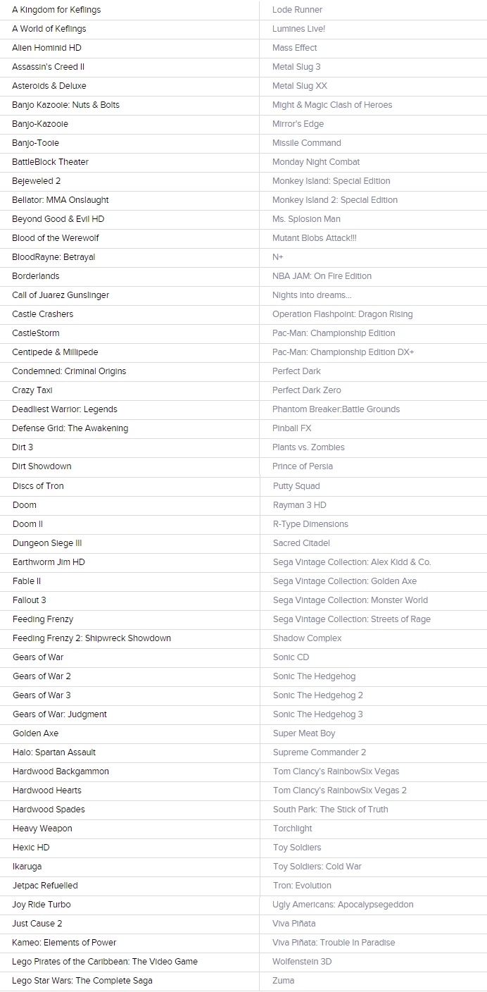 เมื่อวันจันทร์ที่ผ่านมา Mike Ybarra หัวหน้าสตูดิโอ Xbox ได้เปิดเผยรายชื่อ 104 เกมแรกของ Xbox 360 ที่สนับสนุนความสามารถ Backwards compatibility หรือ ความสามารถในการทำให้ Xbox one เล่นเกมเก่า ๆ ของ Xbox 360 ได้นั่นเอง โดยรายชื่อจะประกอบไปด้วย เกมดัง ๆ อย่าง Assassin’s Creed II, Borderlands, Dirt 3, Fallout 3, เกมทั้งหมดใน Gears of War collection, Halo: Spartan Attack, Just Cause 2, Mirror’s Edge 2, Perfect Dark และ Perfect Dark Zero, Sonic the Hedgehog 1-3 และ Wolfenstein 3D เป็นต้น