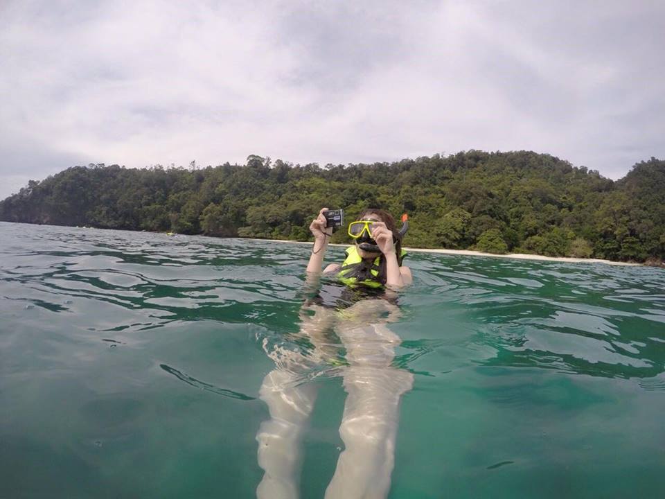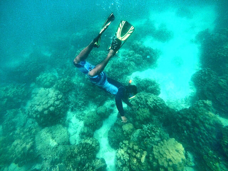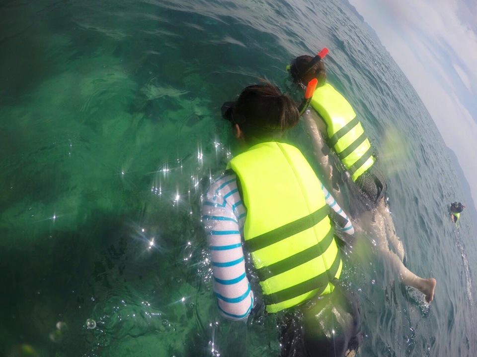 เพราะใกล้ๆฝั่งมีแต่ปะการังที่ตายแล้ว ก็ต้องใส่ชูชีพ กระโดดน้ำตุ๋มลงไปเลย