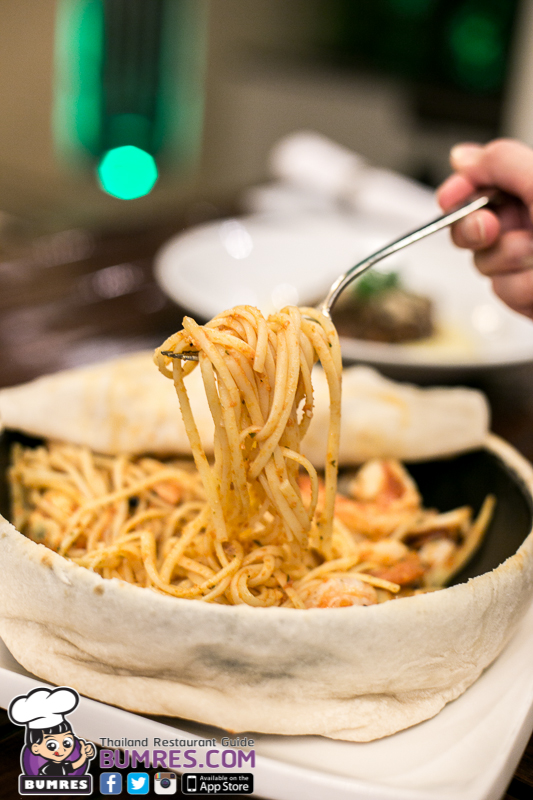 เป็นเมนูพาสต้าที่คลุมภาชนะด้วยแป้งพิซซ่า ภายในก็คือเส้นลิงกวินี่ ที่ผัดมากับซอสสูตรพิเศษที่มีพื้นฐานจากผักชนิดต่าง ๆ รวมถึงแครอท จึงได้สีออกมาส้ม ๆ แดง ๆ ผสมกับซอสมะเขือเทศและไวน์ขาวอีกเล็กน้อย เนื้อสัตว์ที่กินคู่กันก็คือ กุ้งลายเสือ, หอยเชลล์,ปลาหมึก เป็นต้น รสชาติอ่อนตามสไตล์ต้นดำรับ ผมว่าถ้าใช้ซอสมากกว่านี้หรือปรุงให้รสเข้มกว่านี้จะถูกปากคนไทยมากยิ่งขึ้นครับ