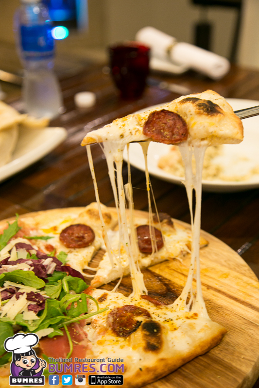 เป็นพิซซ่าที่ชื่อเรียกยากที่สุดเท่าที่เยได้ยินมา แต่หน้าตาก็ไม่ได้แตกต่างอะไรมาจากที่เราเคยกิน ๆ กัน ก็คือหน้าร็อคเก็ต ใส่เบซิล ใส่พาเมซานนี่แหล่ะ แล้วอีกครึ่งนึงก็เป็นหน้าซาลามี่รสเผ็ดที่หน้าตาไม่แปลกแต่รสชาติไม่เคยพบคือเป็นซาลามี่รสเผ็ดเลย หอมเค็มอร่อยดีครับ แป้งพิซซ่าก็นุ่มกำลังดี ชีสมาแบบเต็ม ๆ กินร้อน ๆ ยืด ๆ อร่อยดีครับ