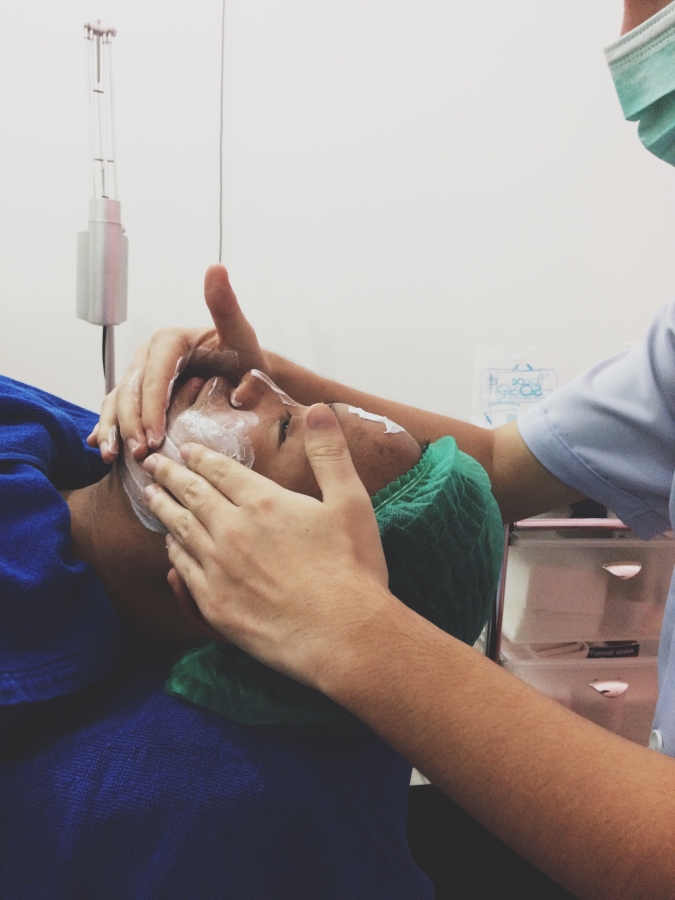 พอถ่ายรูปเสร็จทั้งหมดแล้วก็เข้าห้องเตรียมเชือด จะมีคุณพี่พยาบาลมาล้างหน้าเราให้สะอาดเอี่ยมอ่องและทายาชาบนใบหน้าของเรา และทิ้งไว้ครึ่งชั่วโมง นอนแอ้งแม้งรอคุณหมอเข้ามาจัดการ พอครบครึ่งชั่วโมงปุ๊ป คุณหมอก็เข้ามาเลย ตื่นเต้นมาก กลัวมาก ลุ้นมาก เหมือนเรากำลังจะเสียบริสุทธิ์ของเราไป แต่มันจะโอเค ฮืออ
