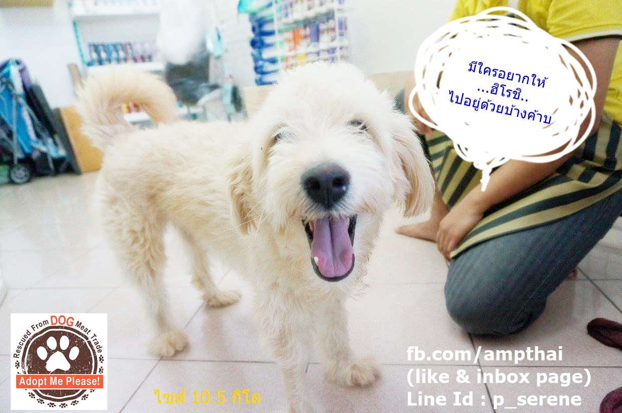 ฮิโรชิ หนุ่มน้อยไซส์ 10.5 กิโล เทอเรียผสมไซส์เล็ก ที่ถูกทิ้งหรือพลัดหลงในสภาพที่ทรุดโทรมลงทุกวัน ต้องอาศัยมาหลบฝนที่ป้อมยามหน้าหมู่บ้านแห่งหนึ่งแต่ไม่มีใครเมตตา จนสุดท้ายทีมงาน AMP ต้องช่วยเหลือพามาตรวจสุขภาพ รักษาพยาธิในเม็ดเลือด ตรวจร่างกายจนพร้อมทำหมัน ทำวัคซีน ตอนนี้มีความพร้อมทุกอย่างค่ะ