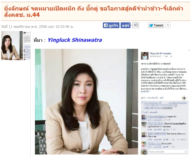 ยิ่งลักษณ์ จดหมายเปิดผนึก ถึง บิ๊กตู่ ขอโอกาสสู้คดีจำนำข้าว-จี้เลิกคำสั่งคสช. ม.44 / ยิ่งลักษณ์สู้ๆ