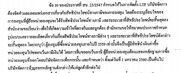 ว่ากองทุน LTF ใช้สิทธิทางภาษีได้ถึงปี 2559 และหลังจากนั้น ห้าม บลจ. ออกหลักฐานการซื้อ LTF เพื่อให้ลูกค้านำไปใช้ยื่นภาษีอีกต่อไป