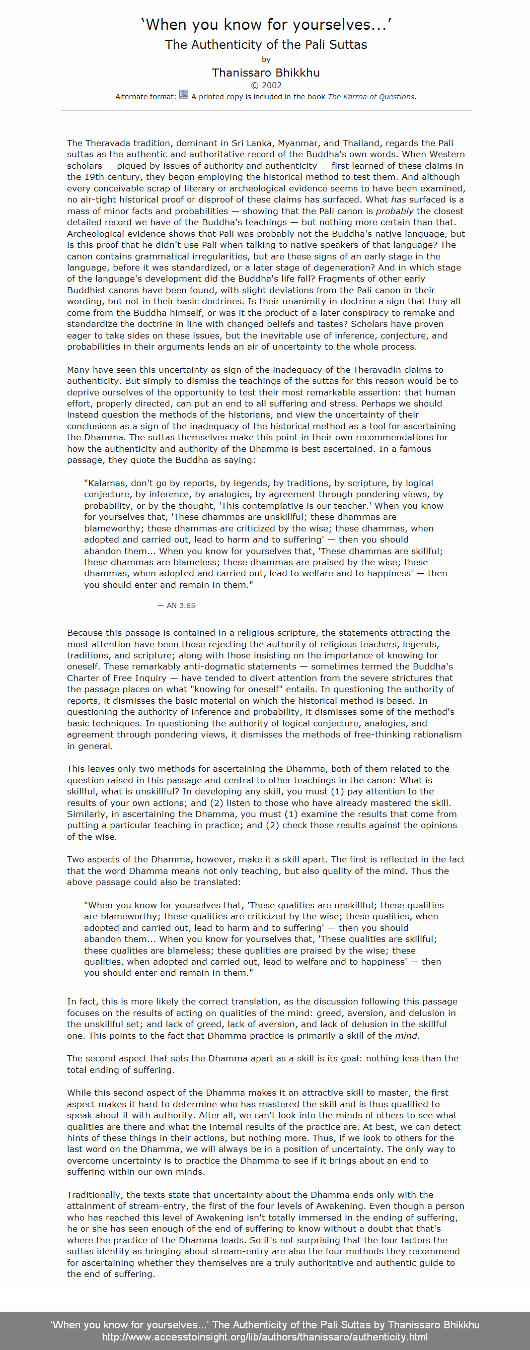 ‘When you know for yourselves...’ The Authenticity of the Pali Suttas