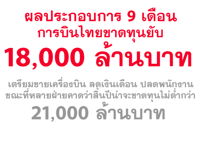 เจ๊งหนัก! 9 เดือนการบินไทยขาดทุนแล้วกว่า 18,000 ล้านบาท หลายฝ่ายคาดปลายปีขาดทุนไม่ต่ำกว่า 21,000 ล้านบาท