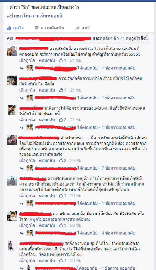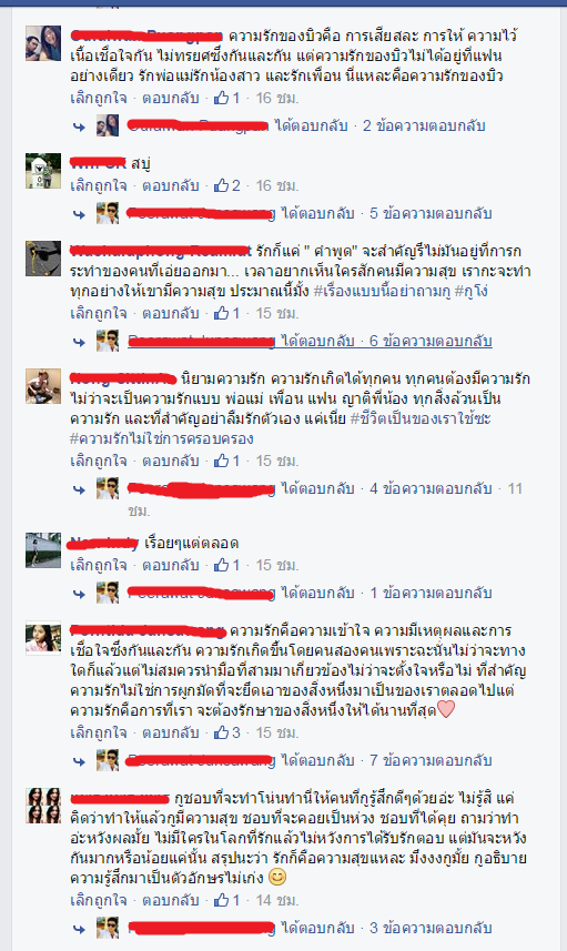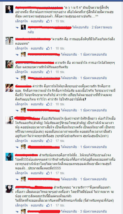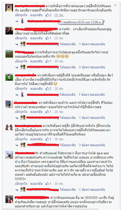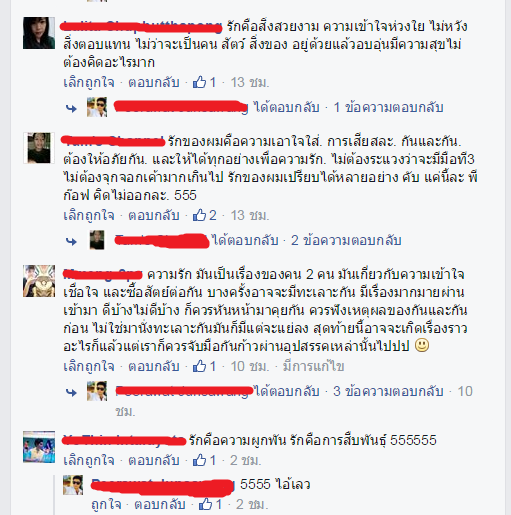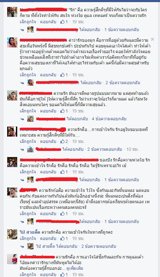 ผมได้รวบรวมความรักของแต่ละคนใน FACEBOOK มาให้อ่านและผมได้นำไปทำความเข้าใจและทุกๆคนก็ตอบผมว่าคล้ายๆกันว่า "ของแบบนี้มันบอกไม่ได้วะ มันต้องรู้สึกเอาเอง"