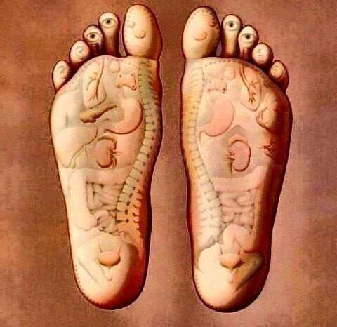 1. สันด้านข้างเท้าด้านในเป็นแนวกระดูกสันหลัง บีบนวดไล่จากสันเท้าขึ้นไปถึงนิ้วหัวแม่เท้า เทียบเท่าการดูแลกระดูกสันหลังจากก้นกบขึ้นไปถึงศีรษะ จะช่วยให้ทุกๆ ระบบซึ่งเชื่อมต่อกับกระดูกสันหลังทำงานดี