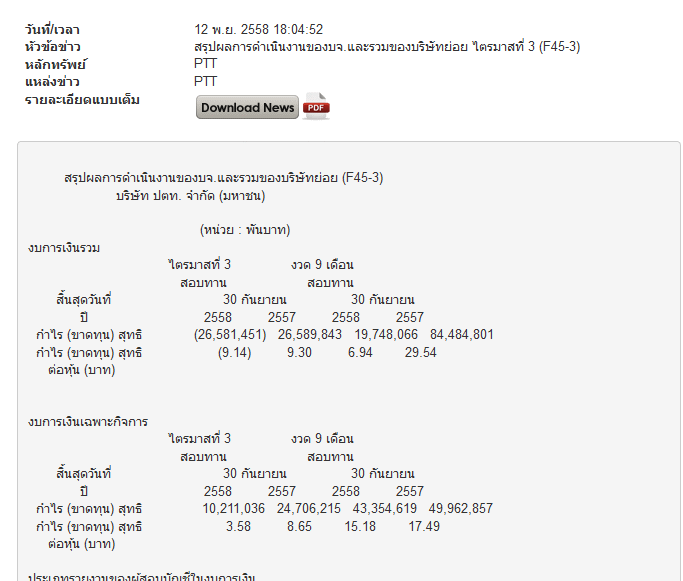 งบPTTep ออกมาแล้วครับ ขาดทุนหนักมาก ไตรมาสสี่2557 ขาดทุน 25,130ล้าน บาท (6.33บาท/หุ้น) เนื่องจากต้องตัดเงินลงทุนในสองแหล่งคือออสเตรเลีย(2,100ล้านus) กับคานาดา (1,500ล้านus) เป็นเงินที่ลงทุนฃื้อกิจการต