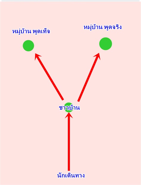 นักเดินทางคนหนึ่ง อยากจะเดินทางไปหมู่บ้านคุณธรรม คือพูดความจริง ตลอด