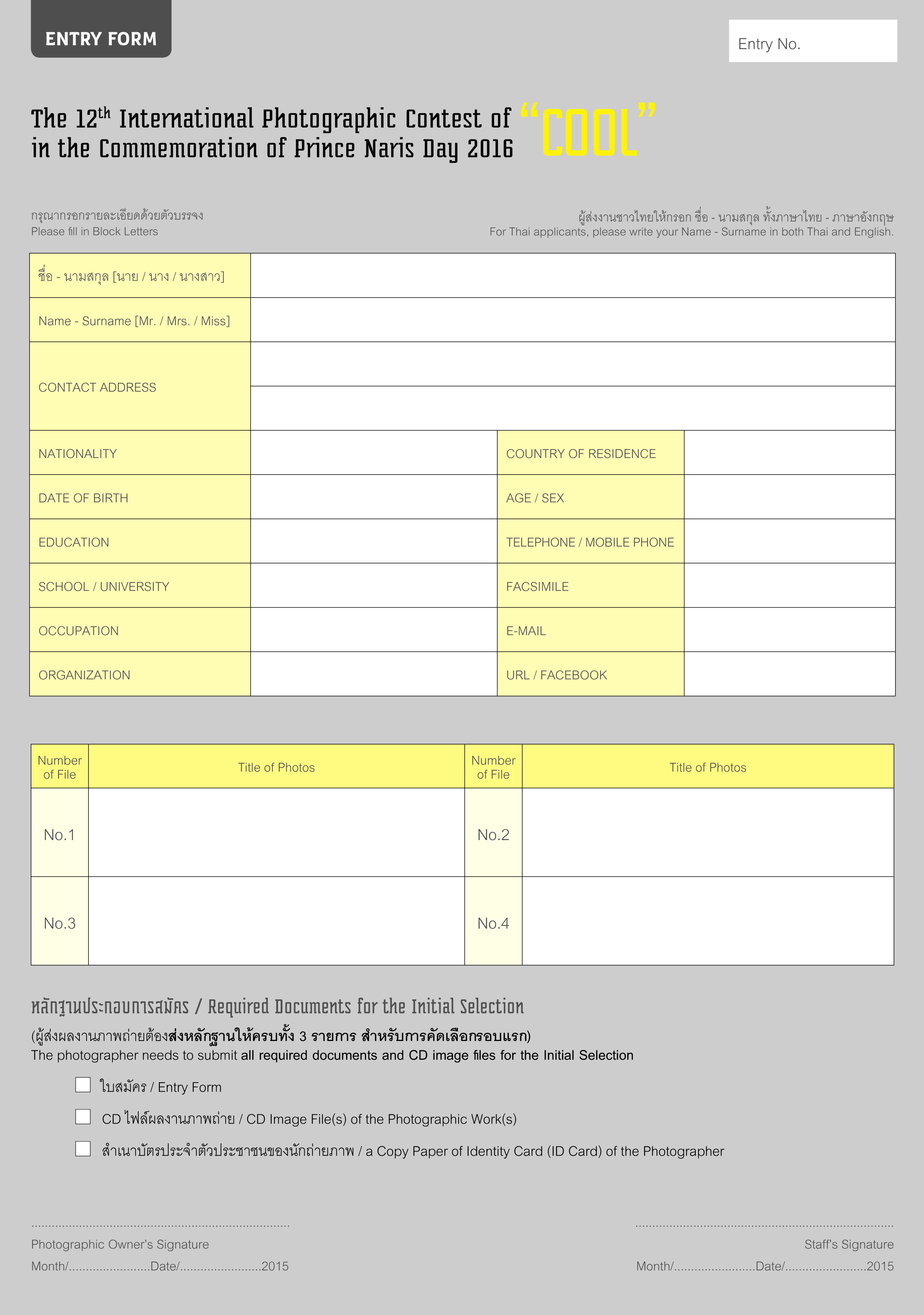 6. ผู้ส่งผลงานต้องกรอกแบบฟอร์มการสมัครตามที่กำหนดไว้ในใบสมัครและระบุข้อมูลให้ชัดเจน พร้อมแนบสำเนาบัตรประจำตัวประชาชนของผู้ส่งภาพถ่าย (จะไม่รับการส่งผลงานทาง E-mail)