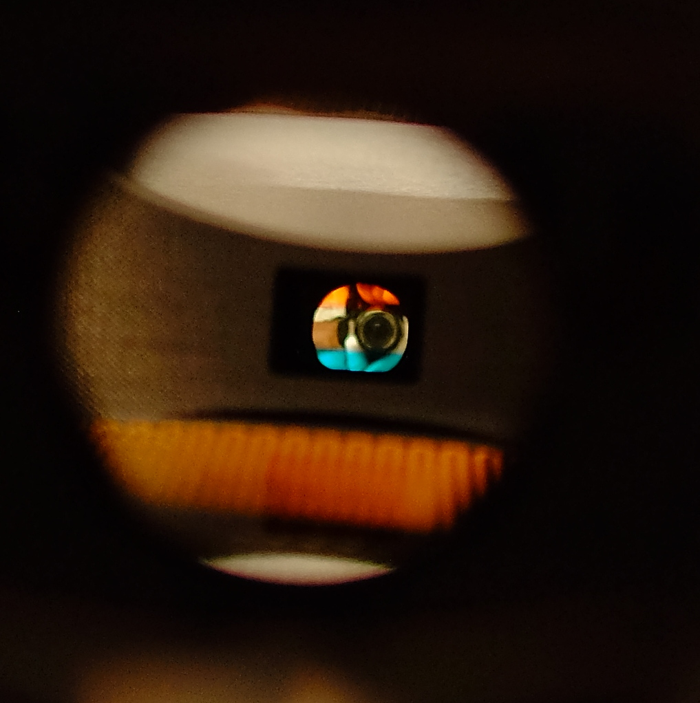 ซูมเข้าไปดูใกล้ๆ จะเห็นส่วนของฟิลเตอร์ทั้ง 4 สีที่ติดอยู่หน้าเซนเซอร์ครับ เส้นเหลืองหยักๆที่เห็นอยู๋ข้างหน้านั่นไม่ใช่เส้นมาม่านะครับ มันคือฮีทเตอร์ที่เอาไว้ควบคุมอุณหภูมิภายในกล้องครับ ตัวกล้องทำจากคาร์บอนไฟเบอร์หากอุณหภูมิต่ำเกินไปก็อาจะเกิดปัญหาได้ครับ