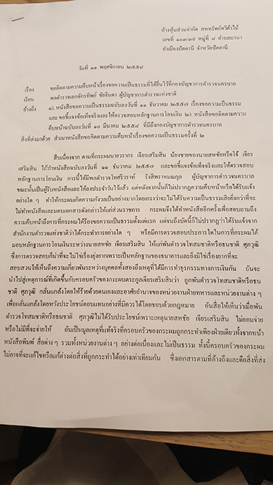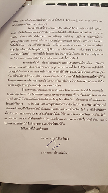 ซึ่งเอกสารของกระผมอันประกอบหลักฐานการโอนเงินและภาพถ่ายอันมีลักษณะเยาะเย้ยในการนำยึดทรัพย์อย่างไม่เป็นธรรมของกระผมและบุคคลภายนอก ทั้ง ๆ ที่พันตำรวจโทสมชาติหรือ ธนชาติ ศุภวุฒิไม่มีส่วนเกี่ยวข้องหรือมีหน้าที่อย่างใด ๆ ในการยึดทรัพย์ แต่สามารถแสดงได้โดยเปิดเผยและยินยอมให้ถ่ายภาพ อันมีลักษณะไม่เกรงกลัวผู้ใดหรือเชื่อว่าไม่มีผู้ใดที่จะให้โทษแก่พันตำรวจโทสมชาติ หรือ ธนชาติ ศุภวุฒิได้ ด้วยเหตุดังกล่าวนี้กระผมจึงขอทำหนังสือฉบับนี้อันเป็นฉบับที่ 3 เพื่อยืนยันในการที่สำนักงานตำรวจแห่งชาติตรวจสอบข้อมูลที่กระผมได้มอบให้ตามหนังสือขอความเป็นธรรมฉบับลงวันที่ 11 ธันวาคม 2557 อันประกอบด้วยหลักฐานการโอนเงินและภาพถ่ายให้เป็นที่แน่ชัดเสียก่อน และได้โปรดแจ้งความคืบหน้าให้แก่กระผมทราบตามที่อยู่ด้านบนนี้ด้วย....ลงชื่อ นายวรากร เจียรเสริมสิน