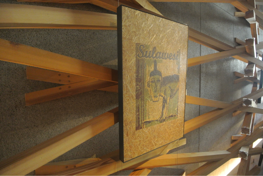 มีภาพศิลปะติดไว้เป็นระยะบนผนังท่อนไม้