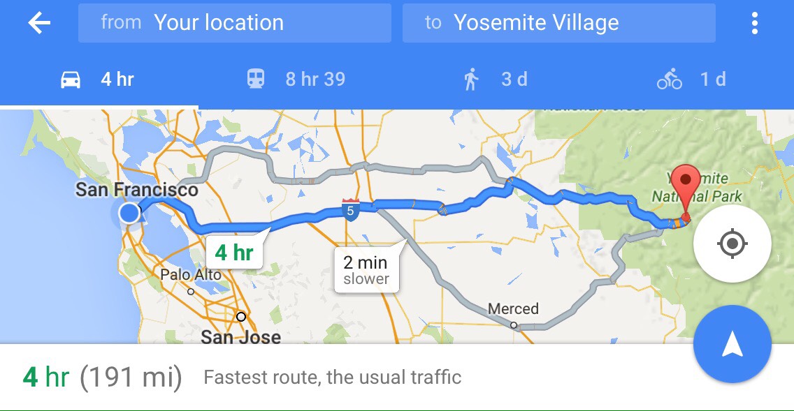 เราเริ่มโดยการเช่ารถขับจากตัวเมือง San Francisco ครับ ขับออกไปทางสะพาน Bay Bridge ผ่านไปทางตัวเมือง Oakland ระหว่างทางมีเมืองใหญ่เรื่อยๆครับ ก่อนขึ้นเขาเข้าไปในเขตป่าของ Yosemite อย่าลืมเติมน้ำมันนะครับ เพราะตรงบริเวณ Yosemite Village ไม่มีปั๊มน้ำมัน มีปั๊มเล็กๆปั๊มนึงที่ Crane Flat (ห่างจาก Yosemite Village ประมาณ 15 ไมล์ และราคาค่อนข้างแพงกว่านอกป่า เพราะฉะนั้นเติมเต็มถังก่อนขึ้นเขาดีกว่านะครับ
