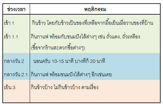 ตอนกลางวัน...... แรกๆของการลดอาหารยังหาทางไม่ได้ ปัจจุบันกลางวัน ก็จะเป็นการแอบนอน 10-15 นาที แล้วค่อยกิน คอนเฟก ผสมมูสเล่ แบบแห้งอย่างนั้นเลยครับ (ส่วนผสม คอนเฟก 3-4 ช้อนโต๊ะ + มูลเล่ 3-4 ช้อนโต๊ะอีกเช่นกัน)