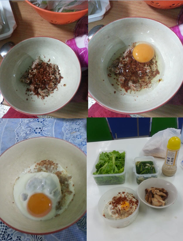 รูปที่ 4 ด้านล่างขวา คืออาหารเช้าไว้พร้อมกิน ครับ กินก่อนเข้าทำงาน เมนู ก็มีผักสด ต้มผัก อกไก่ย่าง ไข่ ด้านล่างมีข้าวนิดหน่อยนะครับไม่เคยขาด น้ำสลัดญี่ปุ่น มื้อนี้ก็ประมาณ 400-500 กิโลแคลลอรี่ครับ อ้อ..ในส่วนของอกไก่ย่างคือผมจะย่างอาทิตย์ละครั้ง ทีละมากๆ แล้วก็เก็บไว้ในตู้เย็นจะกินเท่าไหร่ก็เอาออกมาเวฟ นะครับ ไม่เสียเวลา บางครั้งจะมีต้มผักเหลือจากการที่หลานลดน้ำหนักด้วยมาไว้กินตอนเช้าครับ