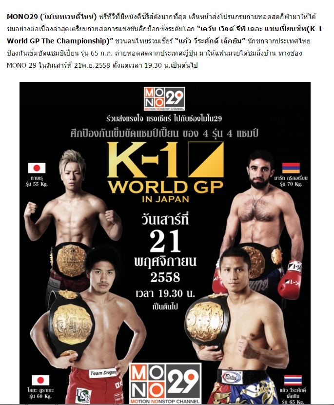 ในวันเสาร์ที่ 21 พฤศจิกายนนี้ที่ช่อง MONO29 ถ่ายทอดสดจากประเทศญี่ปุ่นกันเลยครับ !!