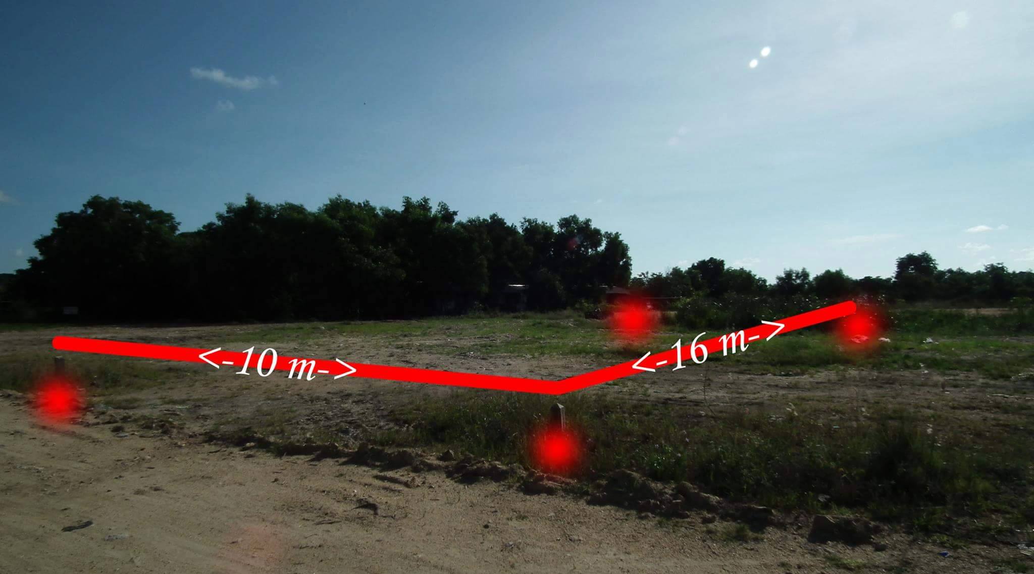 -ที่ดิน เป็นรูปสี่เหลี่ยม ด้านหน้า ติดถนน 10 เมตร ด้านข้าง 16 เมตร