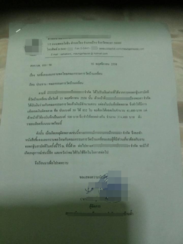 เหตุเกิด ณ ที่วัดบ้านเหยี่ยน ต.บ้านใหม่ อ.เมืองพะเยา จ.พะเยา ได้มีการทอดกฐิน เพื่อสร้างกุฎิ ในวันที่ 15 พฤศจิกายน 2558 เมื่อสิ้นสุดการทอดกฐิน ทางกรรมการวัดได้ทำการตรวจนับจำนวนเงิน รวมทั้งหมดได้ยอดรวมจำนวน 1,2xx,xxx ล้านบาท และได้ให้ทางสถาบันการเงิน(ขอไม่เอ่ยชื่อนะคะ) มาตรวจนับซ้ำ ปรากฎว่าทางสถาบันการเงินได้ทำการตรวจนับเป็นจำนวนเงิน 1,5xx,xxx และได้นำเงินกลับไปตรวจนับซ้ำอีกครั้ง ซึ่งปรากฎว่าทางสถาบันการเงินได้ทำการบันทึกผิดพลาด โดยทำการบันทึกธนบัตร 50 บาท เป็น 500 บาท