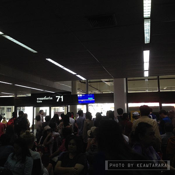 ฟังไม่ทันจะได้ศัทพ์ดี ก็เดินตามคนเขาไปเรื่อย ๆ และลงบันไดเลือนไปด้านล่าง ผู้คนคับคั่งแน่นจนแทบจะต้องยืนเบียด เสียงเรียกผู้โดยสารกึกก้องดังไปหมด ท่าอากาศยานตอนนี้ คล้าย ๆ กับหมอชิตในช่วงเทศกาล