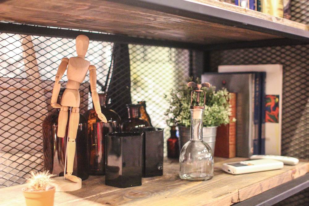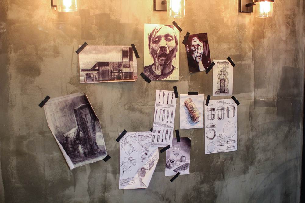 บรรยากาศโดยรวมของร้านจะโล่งโปร่งสบาย เพราะด้วยลักษณะที่มีเพดานสูง ด้านฝั่งนึงเป็นกระจกมองออกไปเห็นวิวด้านนอก แล้วอีกฝั่งนึงเป็นกระจกเงาสะท้อนทำให้ร้านดูกว้างขึ้นด้วย ละทุกๆโต๊ะจะมีเฟรมผ้าใบวางอยู่ ให้ลูกค้าได้วาดรูปกันด้วย
