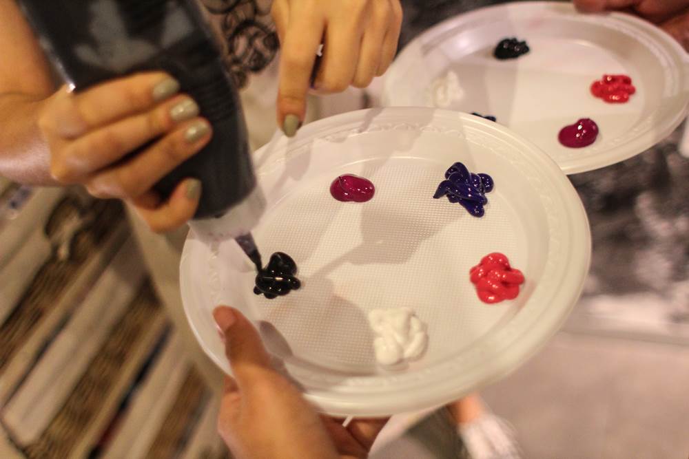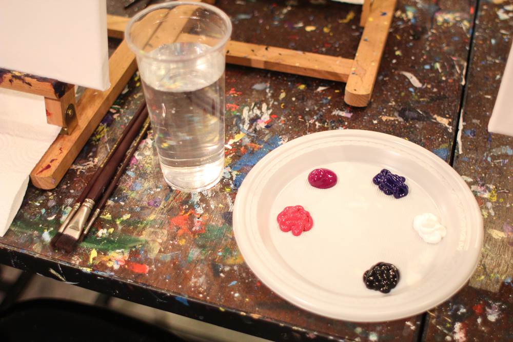 มาวาดรูปกันเถอะ! ตอนแรกบอกเลยว่างงมากเพราะแฟนพาไปไอเราก็ไม่รู้วาดต้องวาดอะไรยังไง ตอนแรกเลยพี่เค้าก็บอกให้ไปบีบสีได้เลย เราก็เดินไปตรงที่พี่เค้าให้บีบให้ตามรูปด้านบนเลย สีที่ใช้เป็นสีอะครีลิก มีแก้วสำหรับล้างแปรง และพู่กันมาให้สามแบบ มีหัวกลมเล็ก หัวกลมใหญ่แล้วก็หัวแบนอันใหญ่อีกหนึ่งอัน นอกจากนั้นก็มีผ้ากันเปื้อนให้ใส่อีกด้วย
