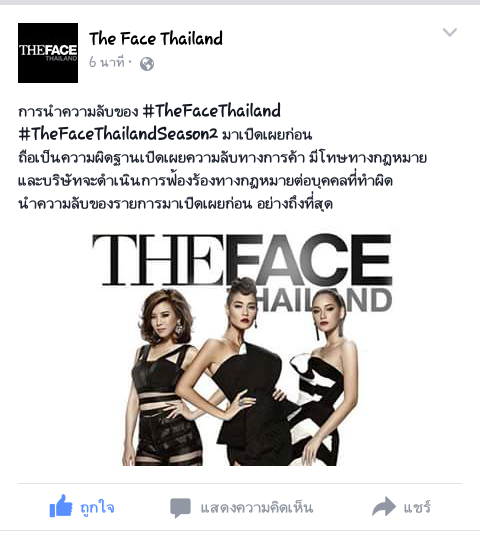 จากข้อมูลหน้า facebook ของ the face มันทำให้เราตกใจเล็กน้อยอะ เพราะ พี่เกดแกเอารูป HBD วันเกิดคุณเต้ลง ทำให้ชาวน pantip สปอยได้ถึง 8 EP อะ กังวัลใจ สงสารคุณแม่ ไม่อยากให้คุณแม่โดนฟ้อง ทำไงดี