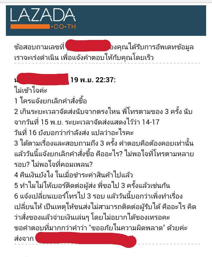 สั่งซื้อสินค้า โอนเงินแล้ว ไม่มีการส่ง อ้างติดต่อไม่ได้ ไม่ให้เบอร์ผู้ส่ง สุดท้ายแจ้งยกเลิก คืออัลไล??? LAZADA