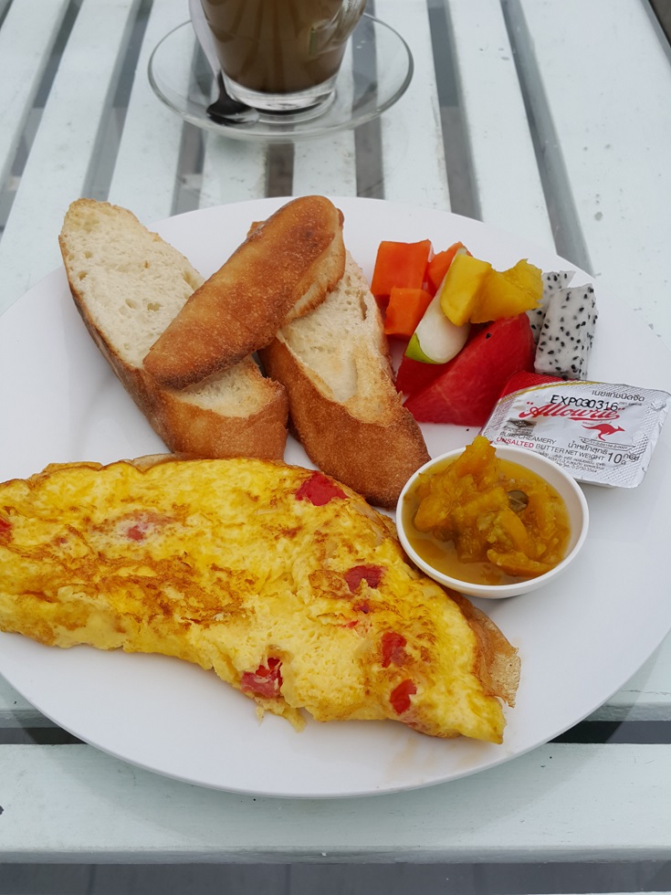 เช้าของวันที่ 5พย. ตื่นมาแบบสบายๆประมาณ8โมง อาบน้ำแต่งตัว พี่ขาวจุงกะเพื่อนก็ตกลงกันว่าเช้านี้จะฝากท้องไว้กับร้านอาหารของที่พัก ตกลงกันได้แล้วก็ไปสั่งอาหารกันเลยย ... พี่ๆทั้ง2คนสั่งออมเลต หนมปัง กะกาแฟ เรามาดูหน้าตาอาหาร และบรรยากาศกันดีกว่าค่ะ