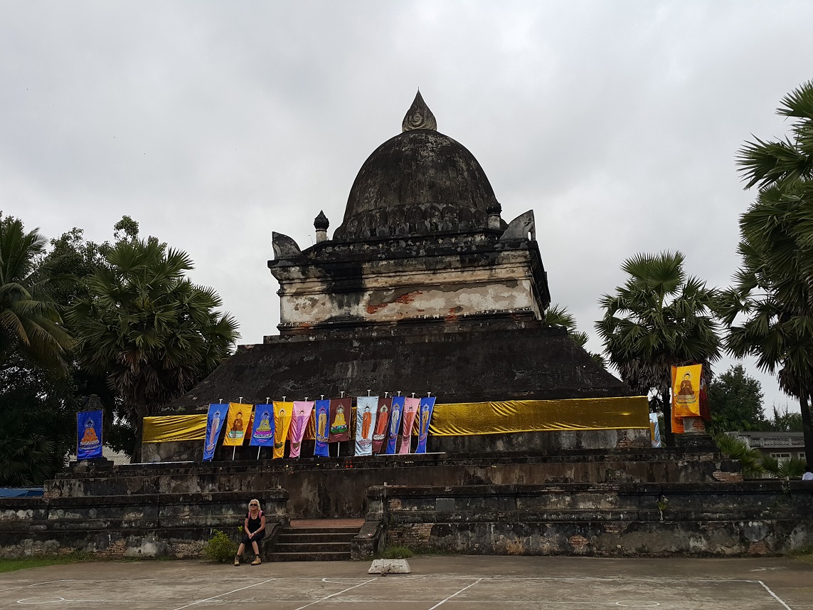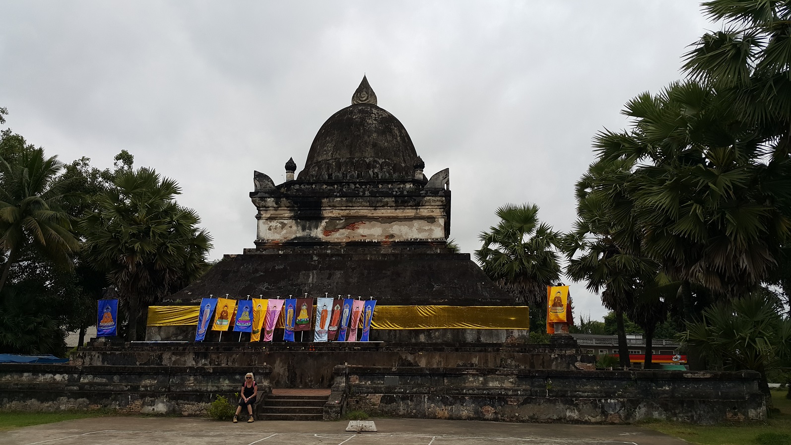 กินเสร็จ พี่ขาวจุงก็ไปสอบถามเรื่องที่เช่ามอไซค์กะที่แลกเงินจากทางเจ้าของที่พัก ..น่าจะเป็นคนฝรั่งเศสที่มาทำธุรกิจที่นี่ ได้ความว่าถ้าอยากแลกเงินได้เลทดีๆต้องไปแลกกะร้านจิวเวอรี่ ซึ่งตอนที่ไป เลทอยู่ที่ 220-230กีบ/บาท ถ้าแลกกับธนาคารจะได้แค่220กีบ อืมมมพอได้ข้อมูลก็ออกเดินเพื่อไปแลกเงินกันเลย เดินมาสักพักมองเห็นวัด เอ..เคยเห็นในรีวิวนี่นา พระธาตุหมากโมใช่มะ..เก็บภาพซะนิดนึง แต่พอดีอากาศครึ้มๆมืดภาพเลยไม่ค่อยสวยเท่าไหร่
