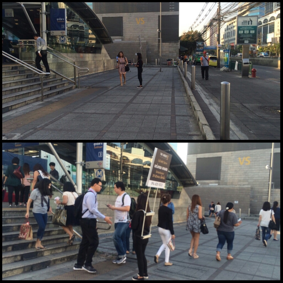 อธิบายภาพอีกที เราค้องการแนะนำโครงการให้คนทำงาน จึงต้องออกเช้าเพื่อดักรอพวกเขาก่อนเข้างาน เช้าไปเพียงครึ่งชั่วโมง คนโหรงเหรงบางตา ผ่านมาอีกครึ่งชั่วโมงแน่นขนัดแทบแจกไม่ทัน เพียงเท่านี้ที่อยากบอกกัน บางทีคำสั่งแปลก ที่ไม่ผ่านการคิดถึงการทำงานจริง ก็ทำให้เรามุ่งไปผิดสิ่งได้เช่นกัน