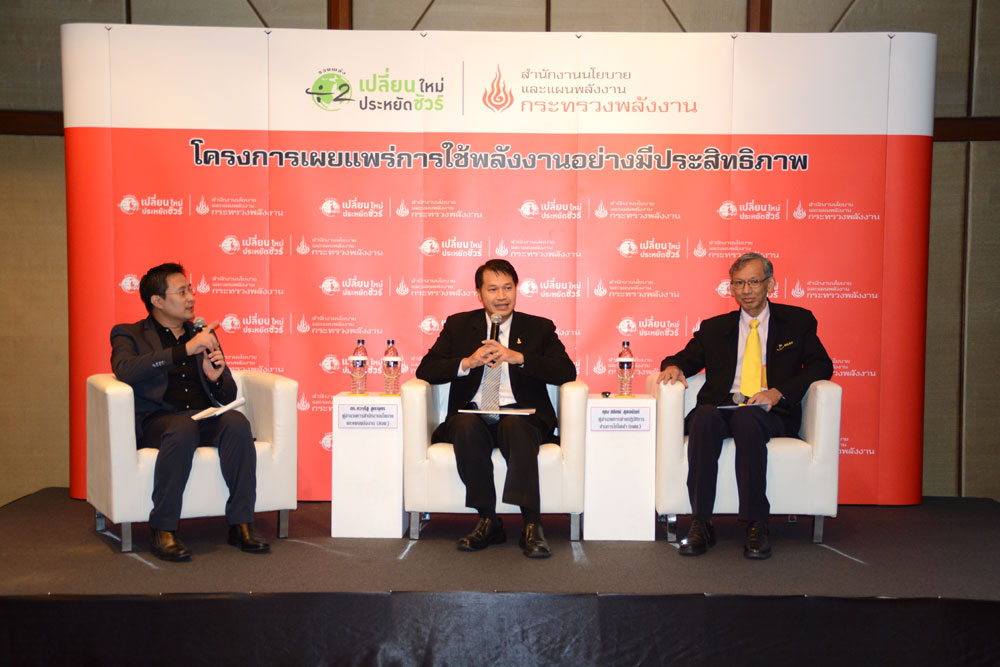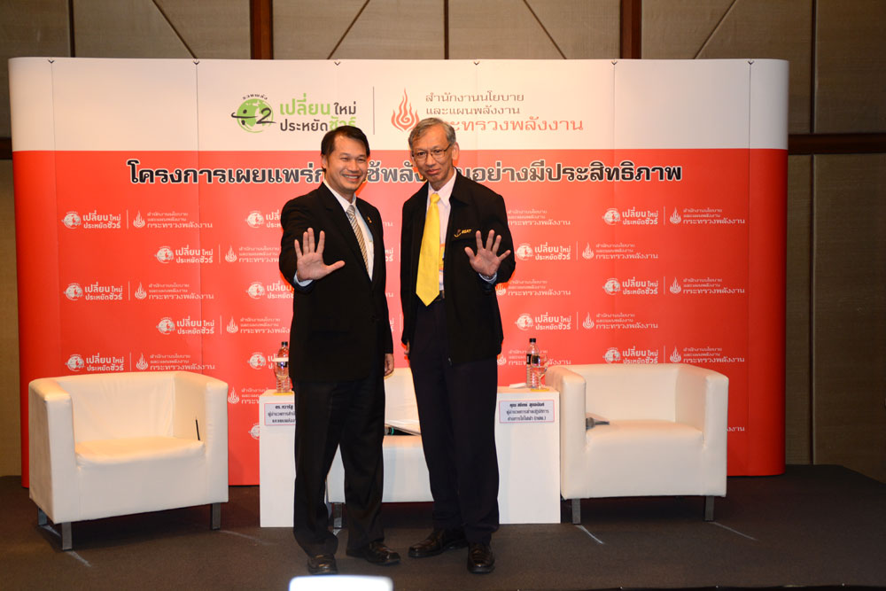 สำนักงานนโยบายและแผนพลังงาน (สนพ.) กระทรวงพลังงาน จัดการประชุมร่วมกับผู้ประกอบการ ในวันนี้ (20 พฤศจิกายน 2558) ณ ศูนย์การประชุมแห่งชาติสิริกิติ์ เพื่อร่วมมือพันธมิตร ผู้ผลิต และผู้จำหน่าย เครื่องใช้ไฟฟ้าประสิทธิภาพสูง หน่วยงานสนับสนุน และภาค SMEs กว่า 60 ราย เร่งส่งเสริมตลาดเครื่องใช้ไฟฟ้าประสิทธิภาพสูง ในโครงการเผยแพร่การใช้พลังงานอย่างมีประสิทธิภาพ ภายใต้แผนปฏิบัติการ“รวมพลังหาร 2 เปลี่ยนใหม่ ประหยัดชัวร์” โดย ดร.ทวารัฐ สูตะบุตร ผู้อำนวยการสำนักงานนโยบายและแผนพลังงาน (สนพ.) และ นายสถิตย์ สุขอนันต์ ผู้อำนวยการฝ่ายปฏิบัติการด้านการใช้ไฟฟ้า การไฟฟ้าฝ่ายผลิตแห่งประเทศไทย (กฟผ.) ร่วมเสวนาในครั้งนี้