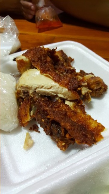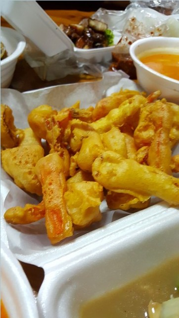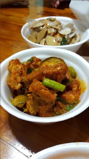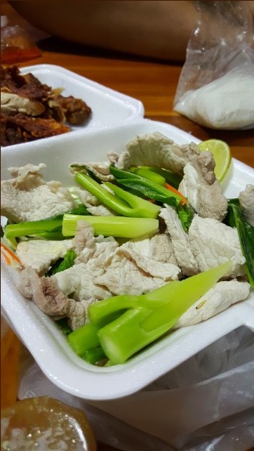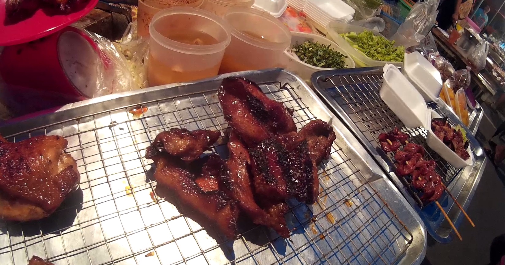 จึงขับรถตระเวนมาเรื่อยๆ จนมาเจอร้านข้าวต้มป้ายสีฟ้าๆ ต้องขอบอกไว้ตรงนี้เลยว่าอาหารที่ร้านนี้ถูก อร่อย คุ้มค่ากับเงินในกระเป๋าที่สุด ระหว่างทางที่เรานำมื้อเย็นของเรากลับมาทานที่ที่พัก เอ๊ะ! เห็นข้างทางมีไฟเยอะแยะ มาขนาดนี้แล้วไม่พลาดที่จะแวะไปอย่างแน่นอน จอดมอเตอร์ไซค์เรียบร้อยก็เดินกันเลย โอ้โห้น่ากินทั้งนั้นนนน เสียดายที่ตอนขามาเขาตั้งร้านช้าเพราะฝนตก เราเดินดูของกินและซื้อจนหนำใจ ได้เวลาที่เราเลือกซื้อกันแล้ว อ่ะซื้อคอหมูย่างล่ะกัน ชุดละ 60 บาท