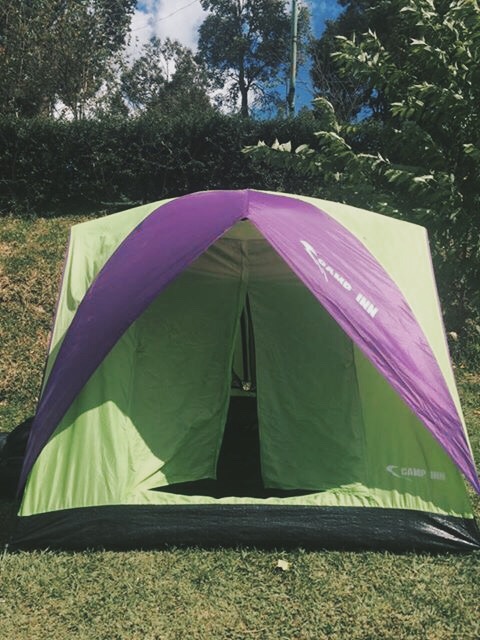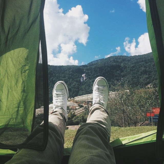 เราเลือกพักที่ดอยชัวร์ญ่า พักแบบเต้นท์เอา เลือกทำเลดีๆ ข้างหน้าเป็นภูเขา ท้องฟ้าสดใส เห็นน้ำตกด้วย