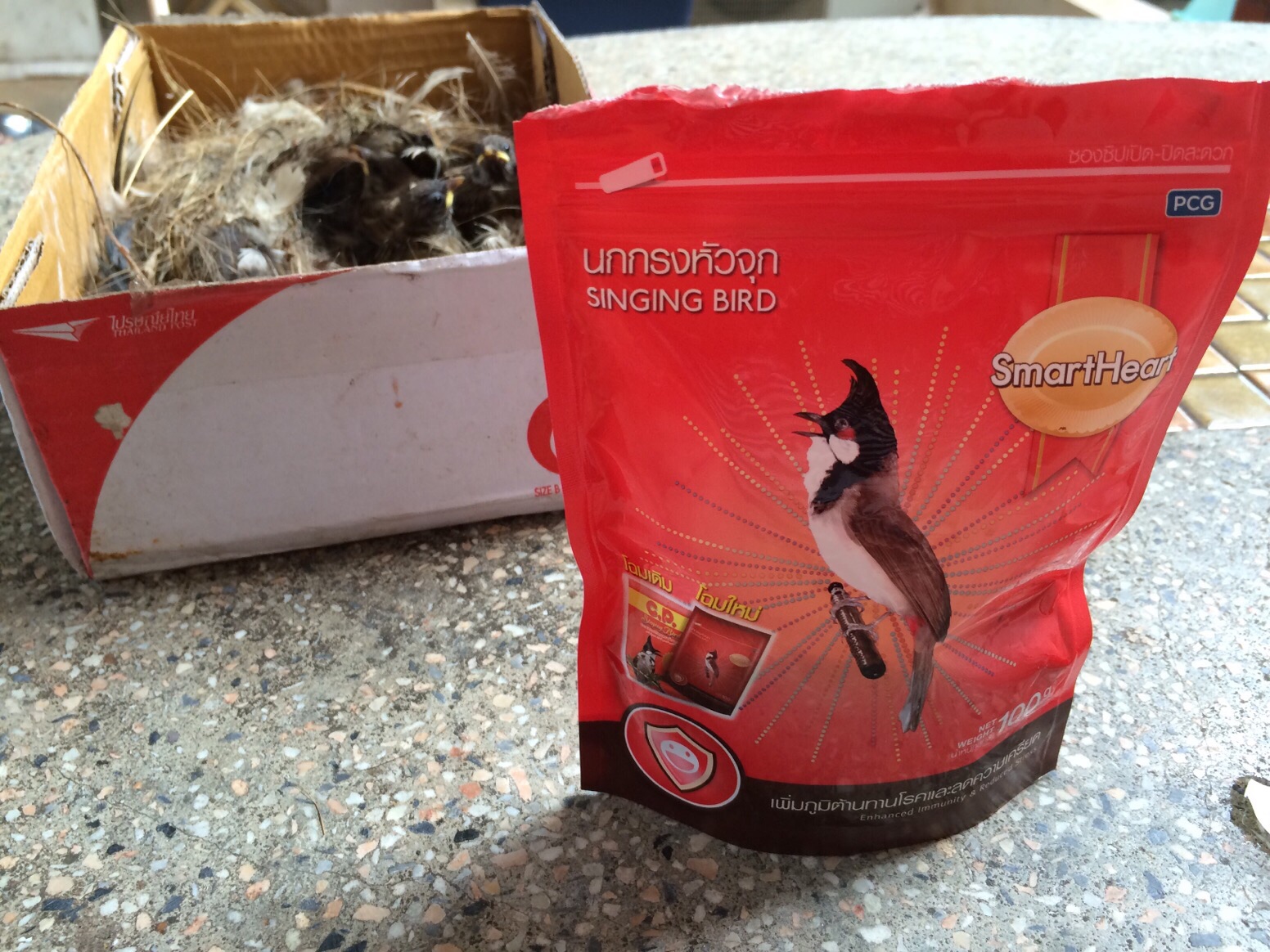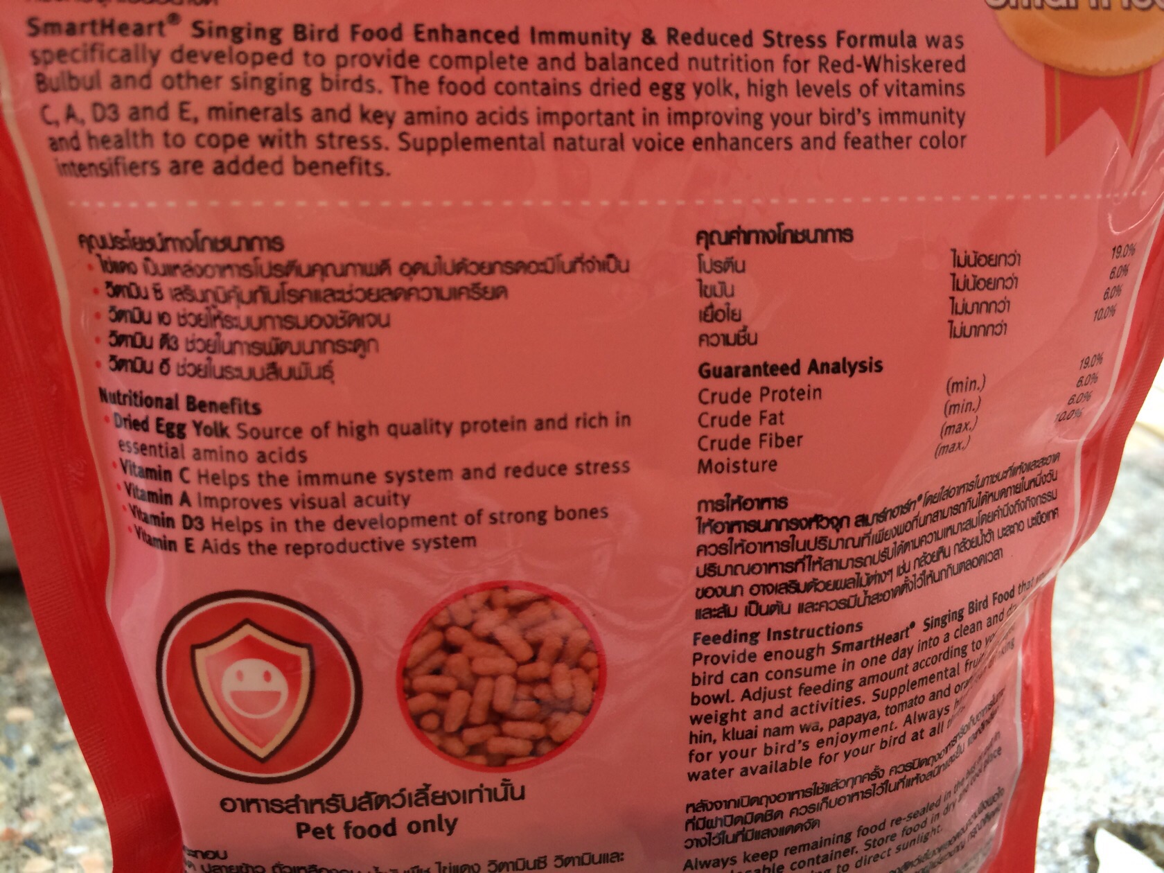 ดูส่วนผสมด้านหลังมีโปรตีนจากไข่แดง อาหารอันนี้น่าจะใช้ได้แหะ เลยตัดสินใจซื้อ กลับบ้านด้วยความลั้ลล้า หาอาหารให้ลูกนกได้แล้ววว ความจริงในเน็ตแนะนำให้กินหนอนนกจะดีที่สุด แต่ด้วยความที่บ้านเราอยู่ในที่ที่ค่อนข้างกันดาร เลยหาหนอนนกไม่ได้ แถมเรากลัวหนอนโคตรๆ คิดสภาพคนกลัวหนอนให้หนอนเป็นอาหารนก คงให้ไปกรี๊ดไปเป็นลมกันพอดี ส่วนไข่แดงต้มอย่างที่บอกไม่มีเวลาเตรียมขนาดนั้น เพราะต้องทำใหม่ในทุกๆมื้อ อาหารนกสำเร็จรูปจึงเป็นอะไรที่เหมาะที่สุดแล้ว