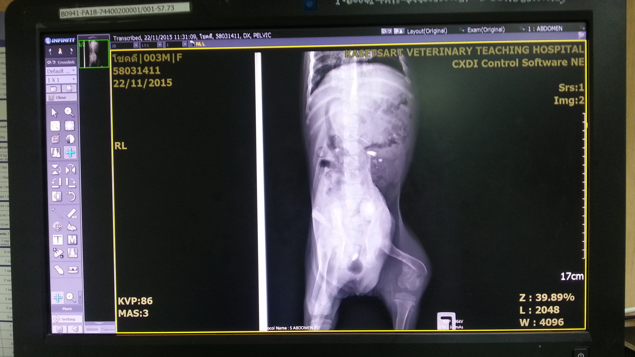 อาการคือ ช่องท้องด้านในเปิด ลำไส้และกระเพาะปัสสาวะ ออกมาจากช่องท้อง แต่ยังอยู่ในผนังหน้าท้อง (ตามรูป) กระดูกเขิงกรานหัก กระดูกขาหลังซ้ายหัก